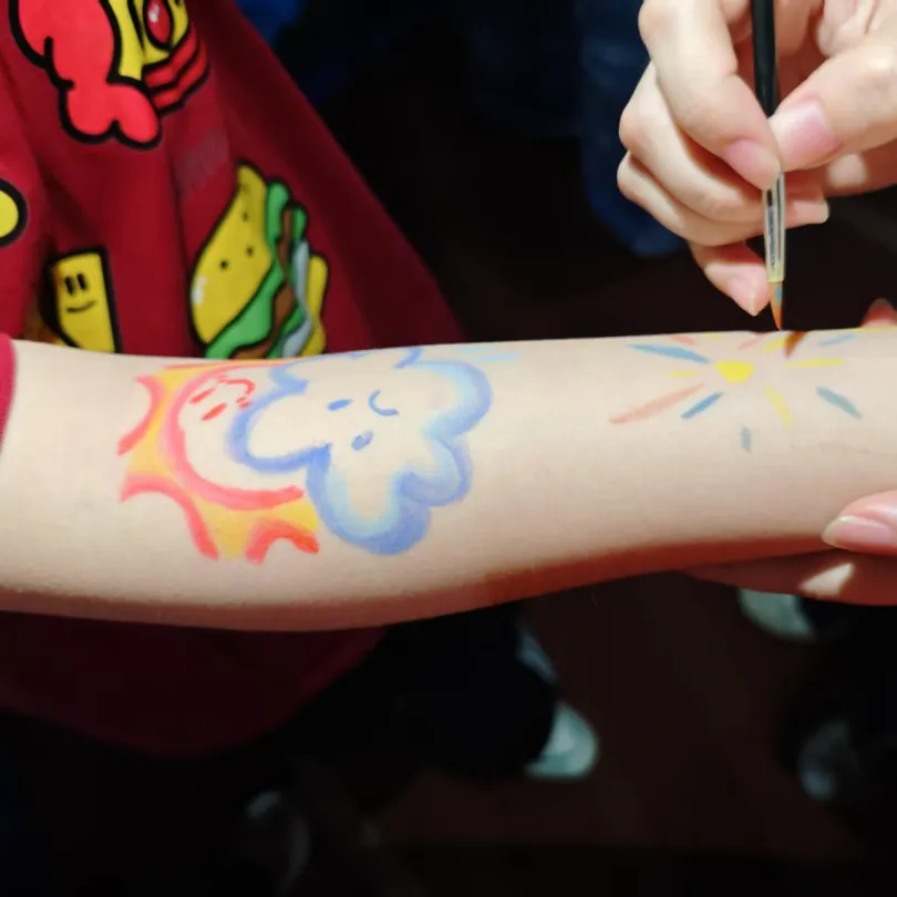 活动现场精心规划,设有大本营、彩绘区、打卡点、补给站等多个功能区域。活动伊始,同学们陆续抵达小足球场大本营,领取荧光手环、荧光头饰及集章卡。彩绘区人气满满,同学们排着长队等画师在手臂上创作,热门图案如蝴蝶、爱心等最受欢迎。随着装备分发完毕,点点荧光逐渐点亮了整个场地,现场洋溢着欢快的气氛。开跑前,工作人员在起跑点为大家详细介绍了活动内容、规则及安全事项。随着主持人一声令下,同学们分批出发,沿着规定线路奔跑,在打卡点收集四个专属印章。夜色中,流动荧光队伍宛如一条绚丽的彩带,为校园增添独特风景。