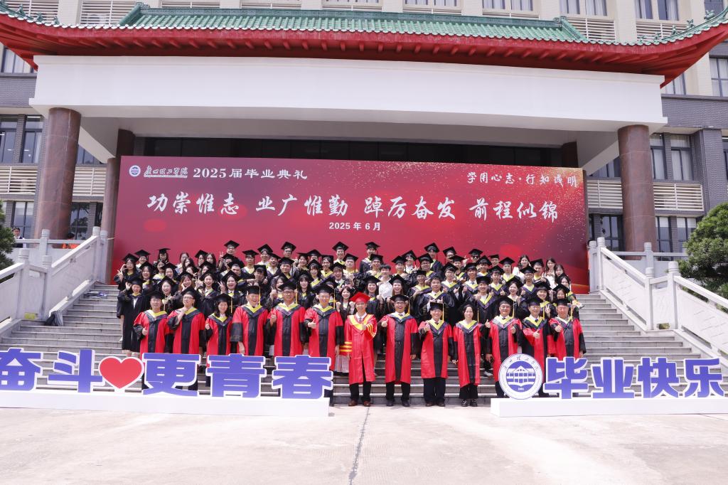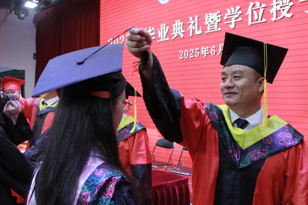 最激动人心的学位授予仪式上,贺敏伟院长、蔡岳良书记等拨穗导师依次为毕业生代表拨穗正冠——流苏从帽檐右前侧移至左前侧,象征着学业有成、破茧启航。这一庄重仪式不仅是对毕业生数年寒窗的肯定,更承载着对他们“知行合一、勇闯新程”的期许。