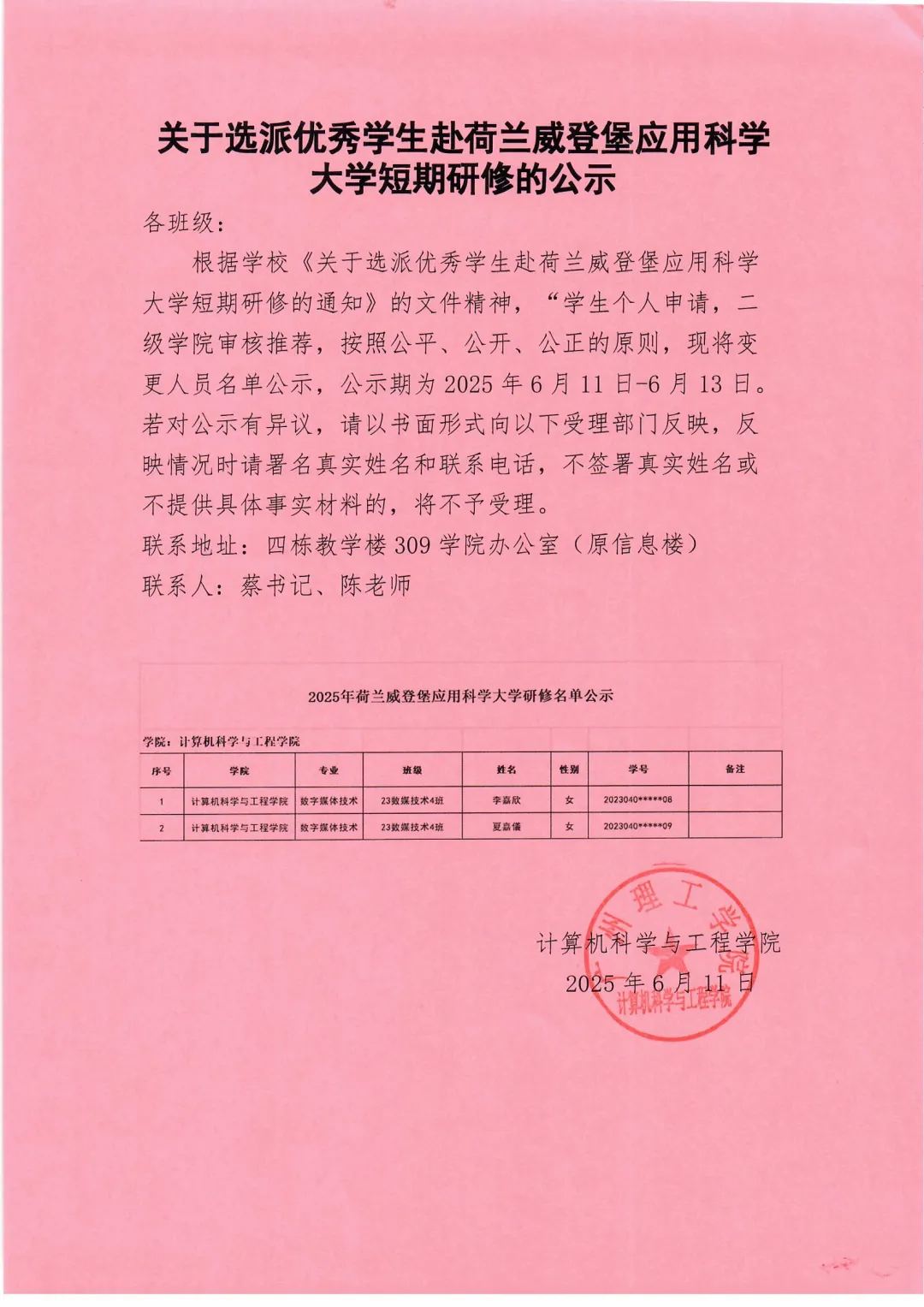 根据学校《关于选派优秀学生赴荷兰威登堡应用科学大学短期研修的通知》的文件精神,“学生个人申请,二级学院审核推荐,按照公平、公开、公正的原则,现将变更人员名单公示,公示期为2025年6月11日-6月13日。若对公示有异议,请以书面形式向以下受理部门反映,反映情况时请署名真实姓名和联系电话,不签署真实姓名或不提供具体事实材料的,将不予受理。