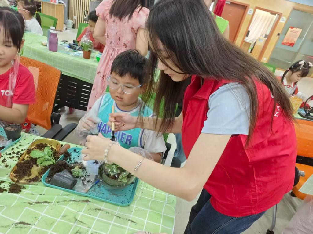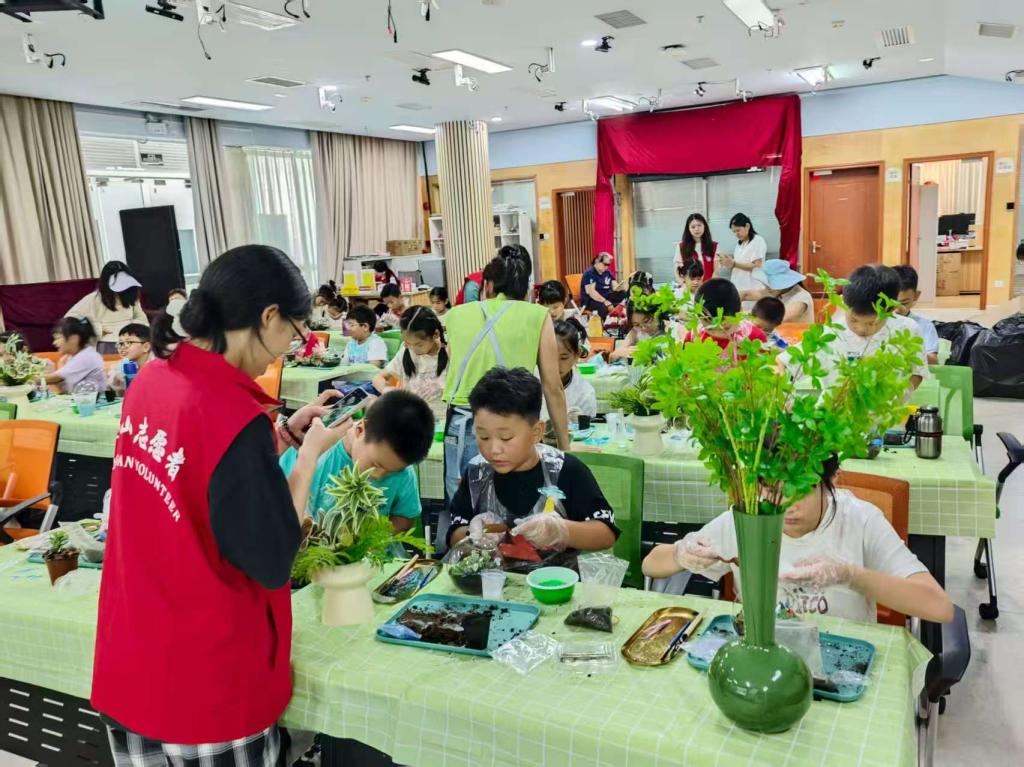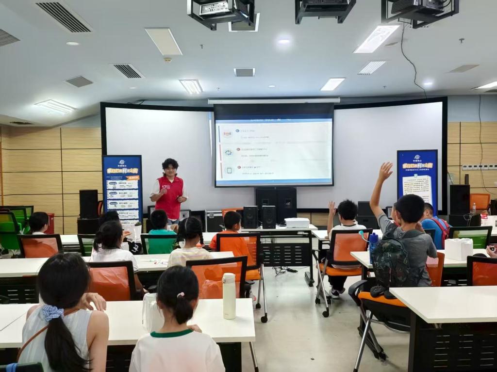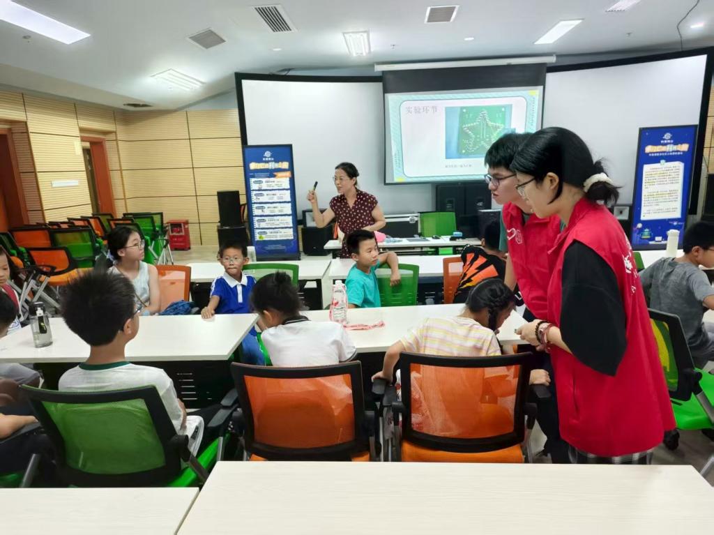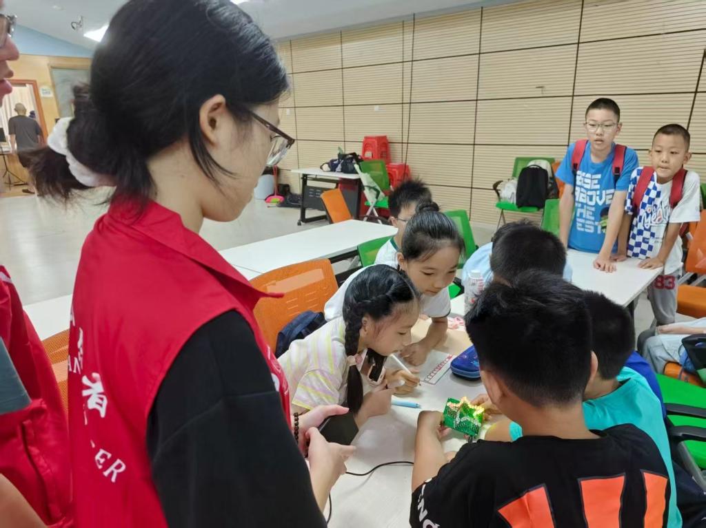 夏令营中,突击队队员与社区教师协同策划了一系列特色课程,让知识在互动中自然流淌:大学城社区马鲁娟老师带来的“炫彩五角星”科技课上,队员们化身助教,引导孩子们动手操作实验装置,在光影变幻中探索科学原理,课堂上不时响起惊叹与欢笑;微观生态瓶DIY活动里,孩子们在队员的指导下分层铺土、栽种绿植、注入清水,亲手打造迷你生态系统,在实践中理解“生物与环境”的共生关系;唐俊峰队员主讲的AI科普课则通过生动PPT、趣味短视频与简易模型演示,将抽象的人工智能技术转化为可触可感的知识,让孩子们轻松读懂科技奥秘。