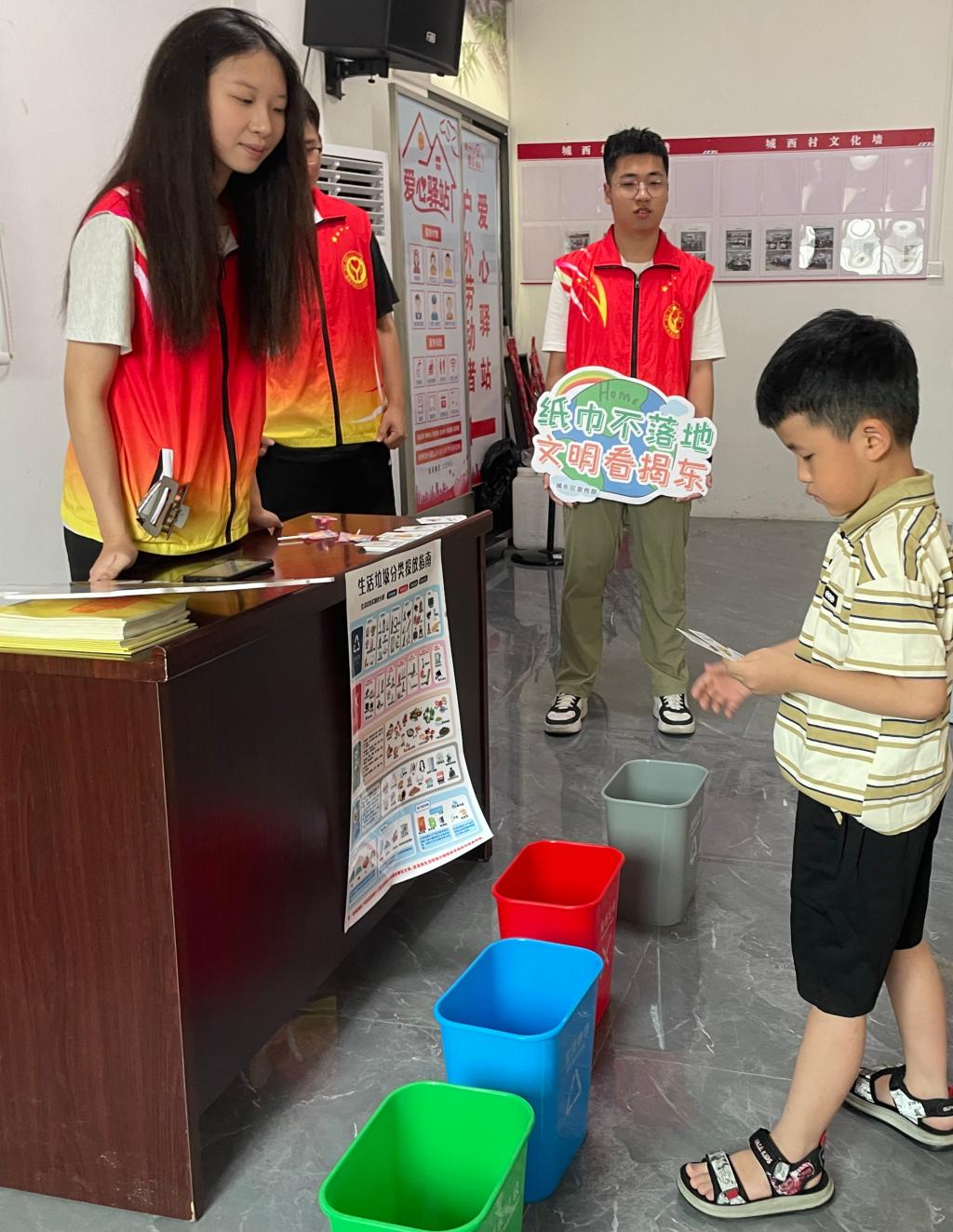 活动筹备阶段,突击队队员精心设计并制作了四色分类垃圾桶模型及数十张生活常见垃圾图案卡片,涵盖塑料瓶、果皮、废电池等日常物品。配合色彩明快的场地布置,打造出集教育性与趣味性于一体的活动空间,为教学活动开展奠定良好基础。