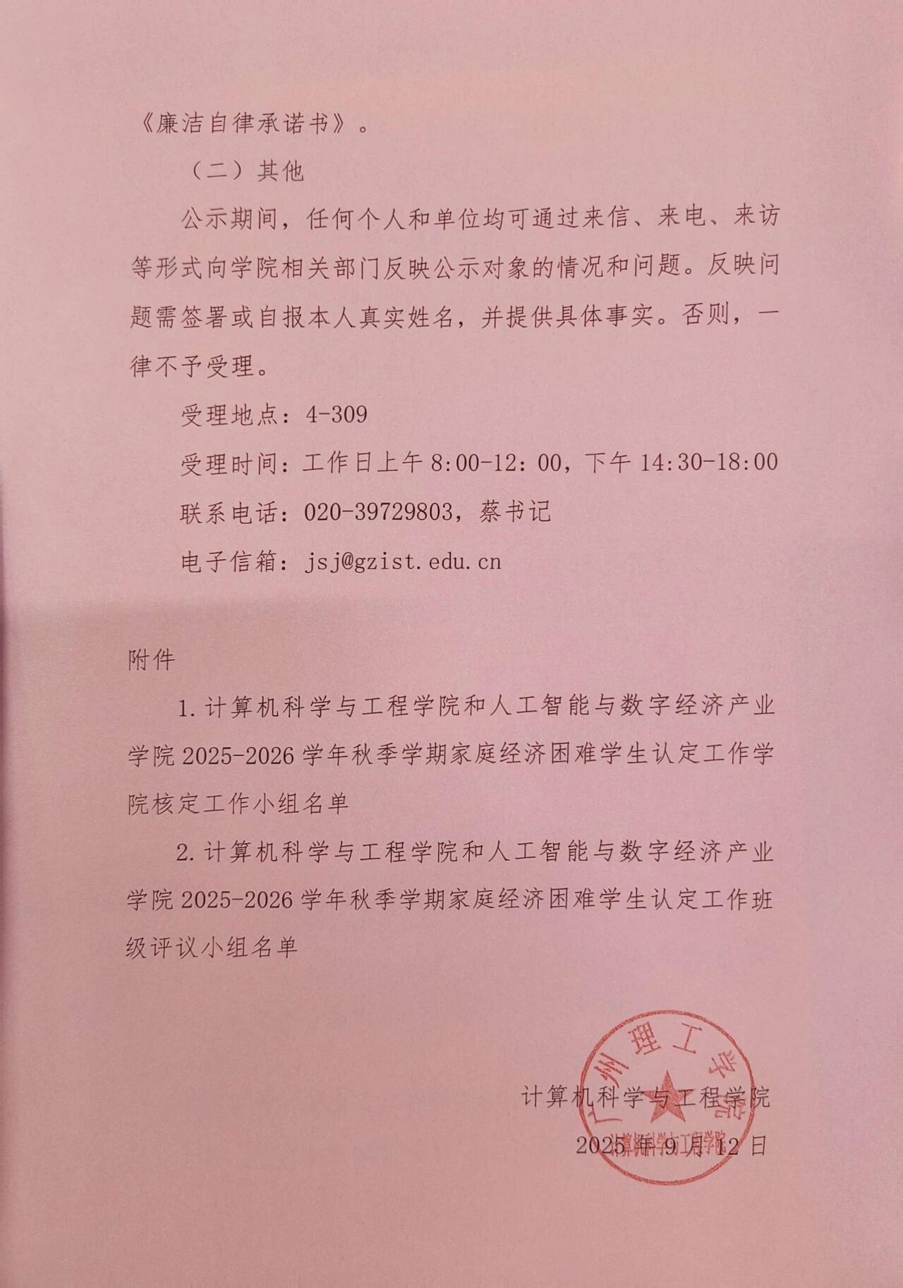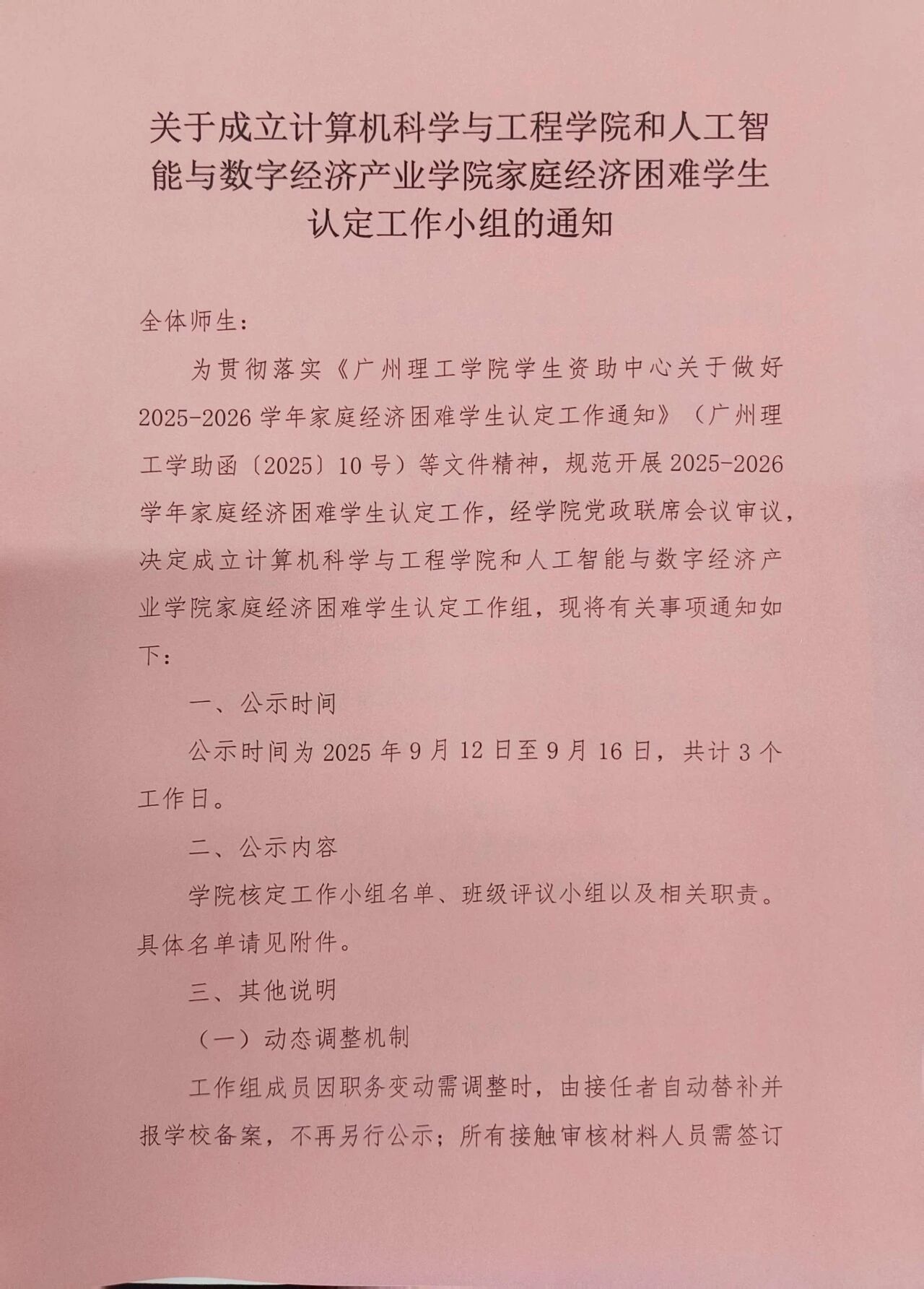 为贯彻落实《williamhill英国官网学生资助中心关于做好2025-2026学年家庭经济困难学生认定工作通知》(广州理工学助函〔2025〕10号)等文件精神,规范开展2025-2026学年家庭经济困难学生认定工作,经学院党政联席会议审议,决定成立williamhill英国官网和人工智能与数字经济产业学院家庭经济困难学生认定工作组,现将有关事项通知如下: