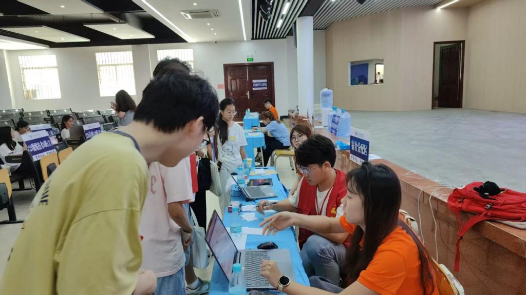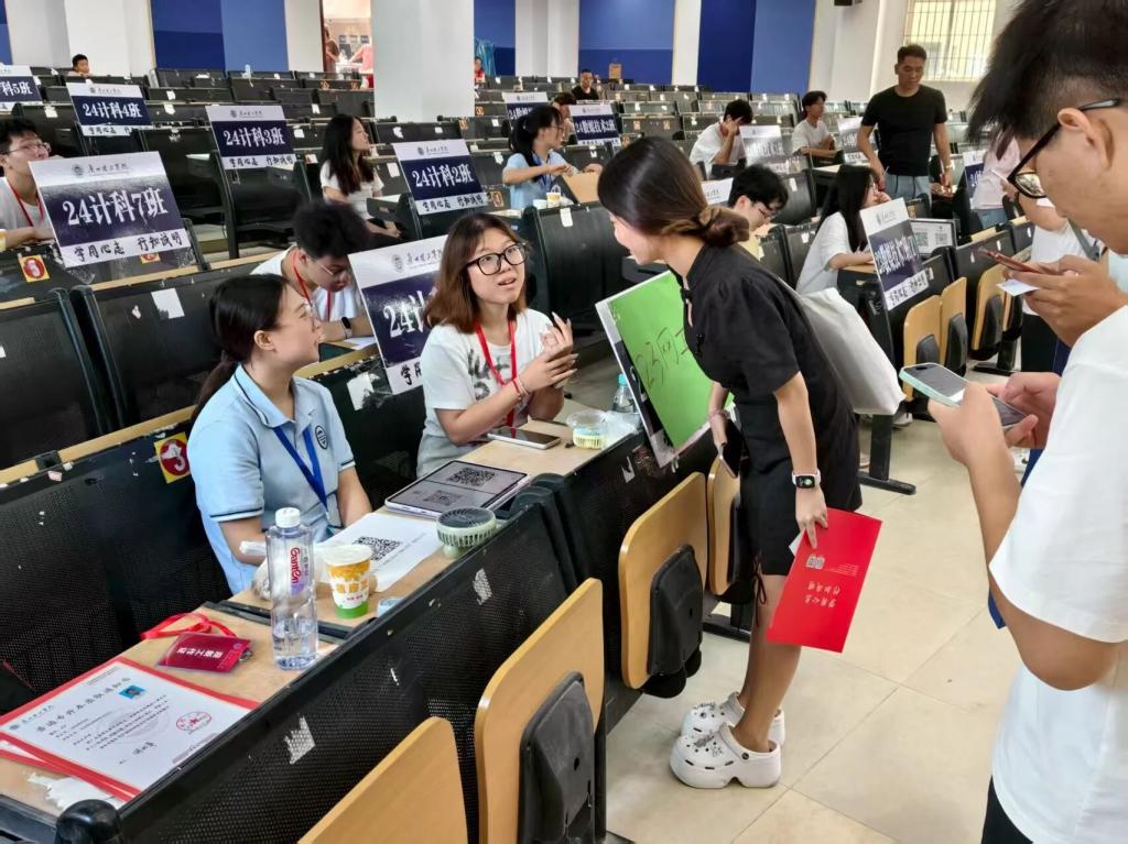 校园报道处,学院领导、老师、学生会成员以及志愿者们分工明确,负责核对新生信息的团学成员,高效办理注册手续;手持校园地图的志愿者,耐心解答 “超市在哪”“宿舍怎么走” 等问题;部分志愿者主动帮新生搬运行李,以饱满的热情和亲切的笑容迎接每一位新生的到来。