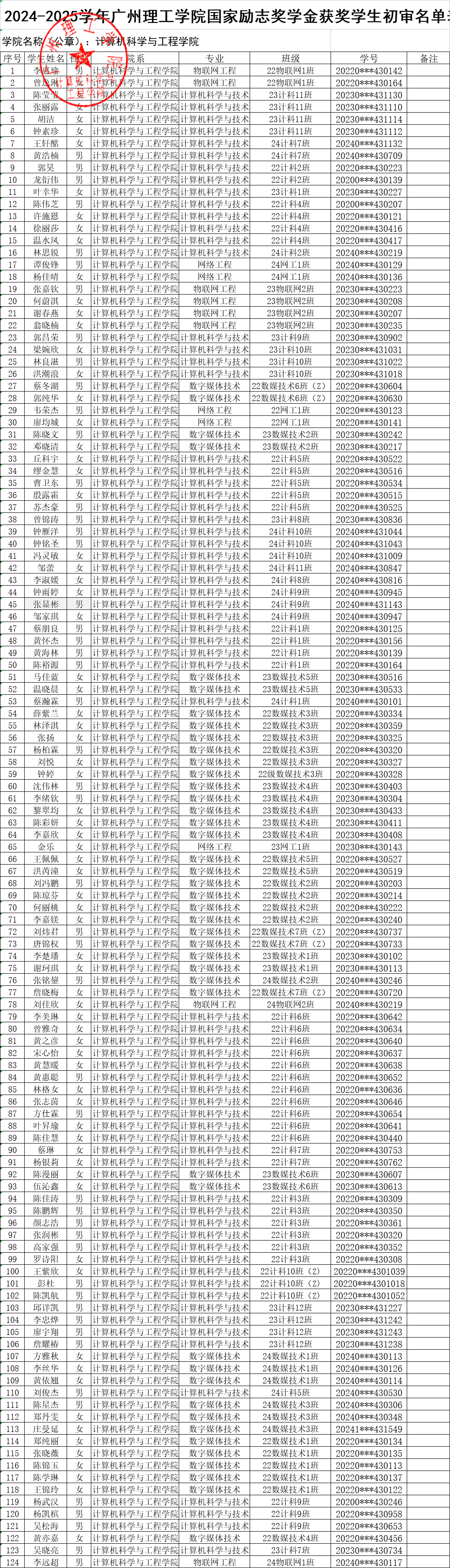 根据《关于开展2024-2025学年国家励志奖学金评选工作通知》(广州理工学助函〔2025〕11号),经学生本人申请及学院评议,现将williamhill英国官网2024-2025学年国家励志奖学金拟推荐名单予以公示。公示期为2025年9月25日至9月28日,共计3个工作日。如对公示有异议,请在公示期内向辅导员老师反馈,或以书面形式并署真实姓名投信到信息楼309办公室旁信箱或电子信箱jsjxy@gzist.edu.cn反馈,也可致电计算机学院办公室:020-87477070。
