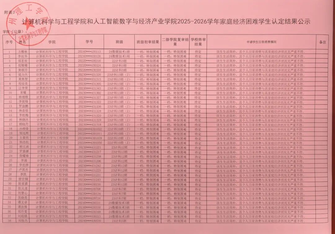 本次公示内容包括学院初审认定的家庭经济困难学生名单及其认定等级。具体名单如下。