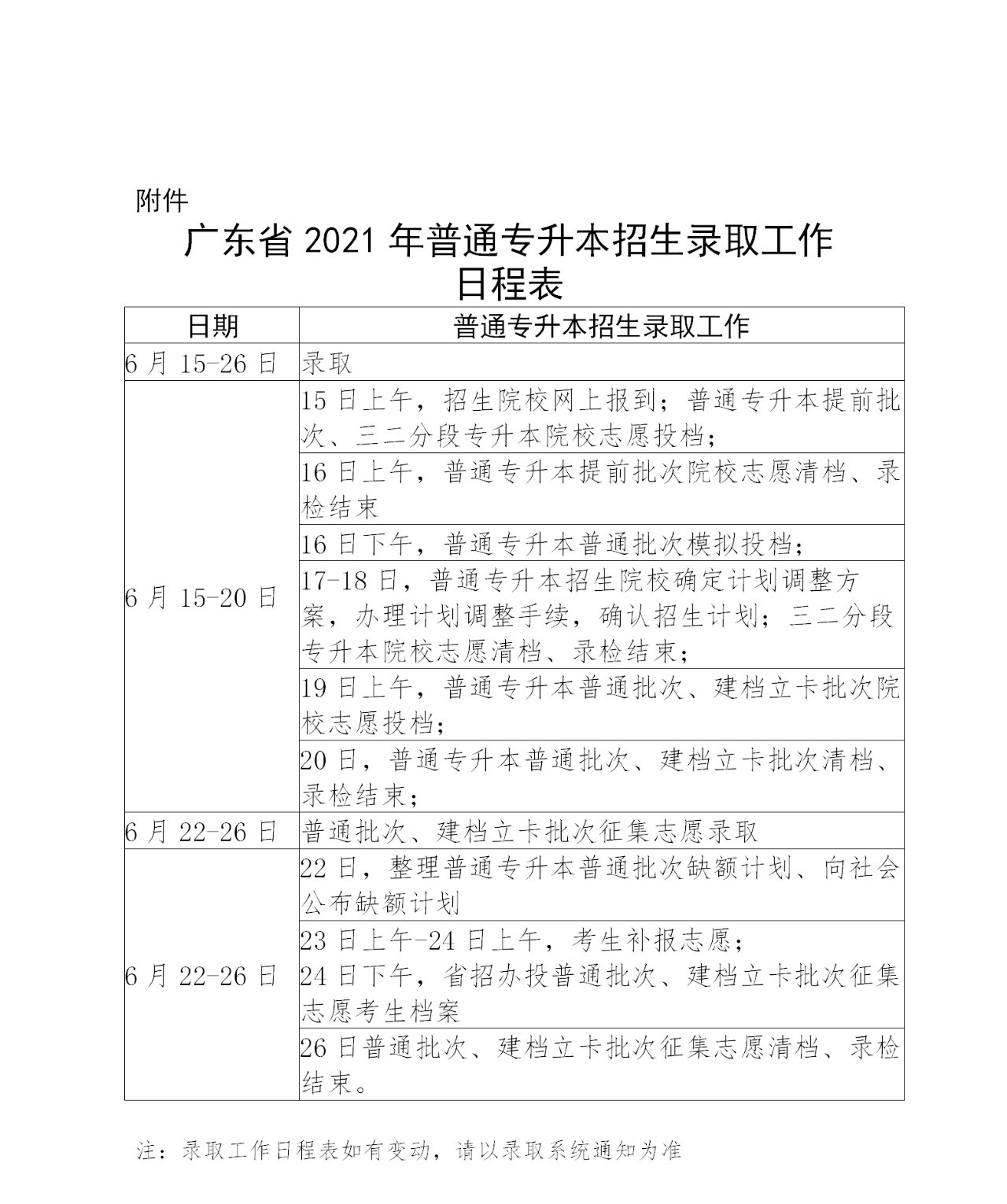 普通专升本招生录取时间为6月15日—26日,详见《广东省2021年普通专升本录取工作日程表》(附件)。